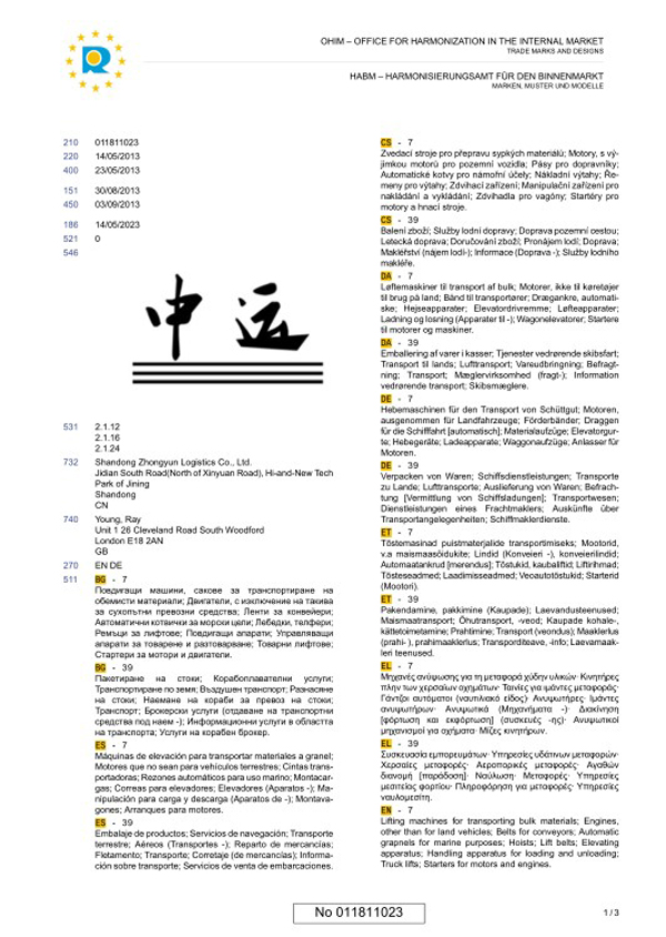 為進一步擴大國際市場,山東中運物流有限責(zé)任公司展開在歐盟申請注冊“中運”商標(biāo)的工作,歐盟商標(biāo)體制是歐盟會議通過的一種在歐盟28個國家使用的商標(biāo)體制。2013年9月,中運物流商標(biāo)成功的在歐盟完成注冊!就此敲開了中運物流在歐盟市場的大門!