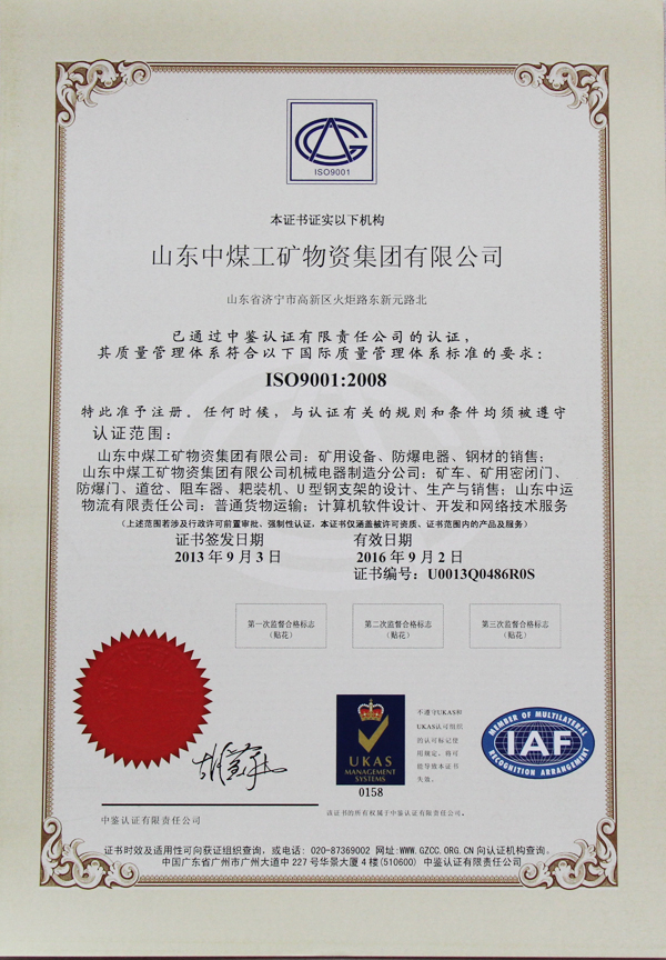 9月23日,山東中煤工礦物資集團有限公司通過ISO9001質(zhì)量認(rèn)證體系審核,榮獲CNAS、ANAB、UKAS質(zhì)量管理體系認(rèn)證證書。